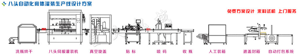 ![]() 自動(dòng)化膏體灌裝生產(chǎn)線方案說明:全自動(dòng)膏體灌裝生產(chǎn)線為星火公司自主研發(fā),擁有技術(shù)及外觀有效證書,是我司針對(duì)食品、日化、醫(yī)藥等行業(yè)的膏體物料而研制,結(jié)構(gòu)合理穩(wěn)定,不易損壞,工作性能好,氣動(dòng)部分均采用德國FESTO和日本SMC的氣動(dòng)元件;自動(dòng)化膏體灌裝生產(chǎn)線氣缸的活塞和缸體均由聚四氟乙烯和316L不銹鋼材料制成,符合GMP要求;灌裝量和灌裝速度均可任意調(diào)節(jié),精度高;灌裝悶頭采用防滴漏、防拉絲灌裝裝置,特別適合蜂蜜、果醬、、糖漿、藥膏、日化、潤滑油、洗潔精等膏體物料的灌裝。 |