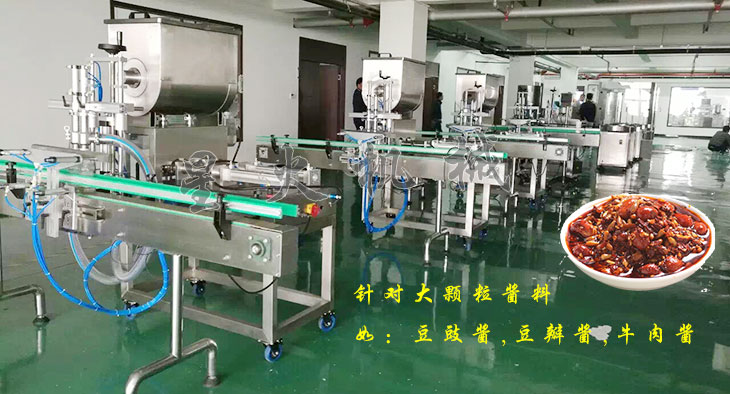 2、蒜蓉香辣醬灌裝機配置兩個灌裝頭,同步工作,效率高,醬料可均勻地被擠壓灌裝到容器里;